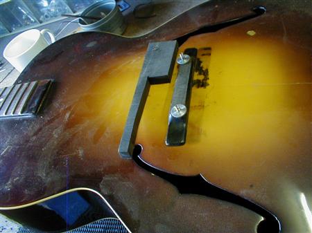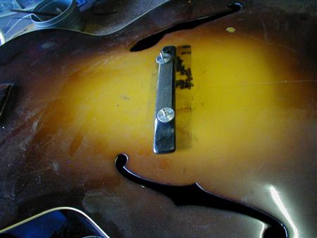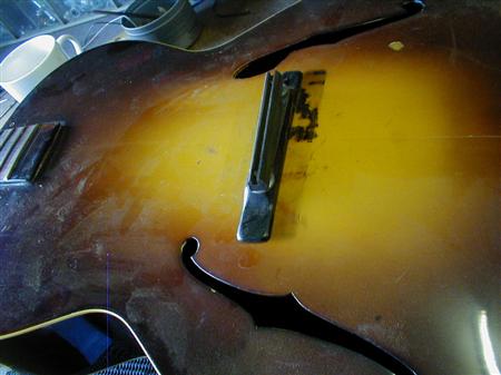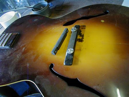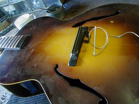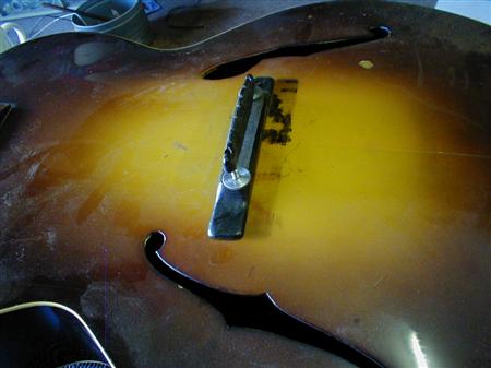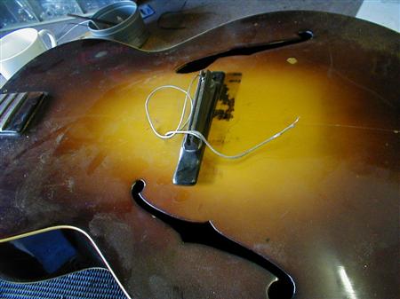 To bring this semi acoustic into the age of electric amplification we custom made a beautiful African Ebony bridge and fitted a pickup. Aged to perfection!