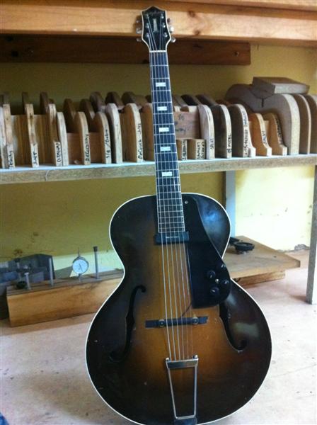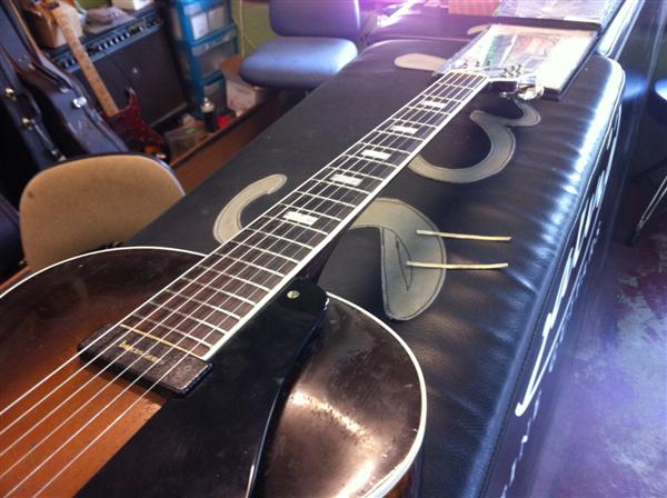 This guitar, a 1954 Epiphone, came in for new neck binding. You can see some of the old stuff on the bench. Fitted and aged to suit.